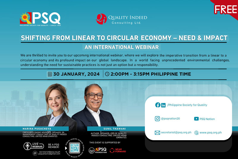On behalf of the Board of the Philippine Society for Quality (PSQ), thank you so much for being our Resource Speakers for the January 2024 international webinar, "Shifting From Linear to Circular Economy – Need & Impact!